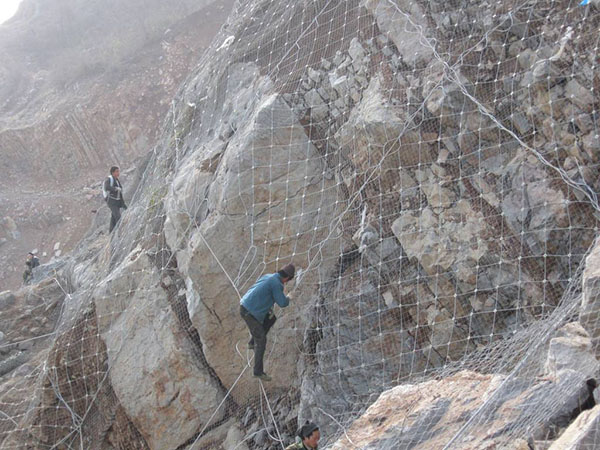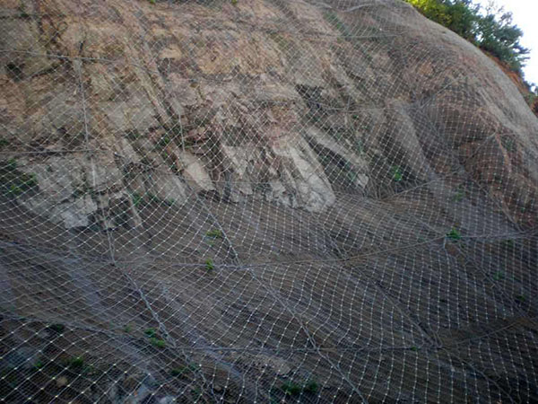 邊坡防護網有主動防護與被動防護,主動防護系統是以鋼絲繩網為主的各類柔性網覆蓋包裹在所需防護斜坡或巖石上,以限制坡面巖石土體的風化剝落或破壞以及為巖崩塌(加固作用),或將落石控制于一定范圍內運動(圍護作用)。被動防護是由鋼絲繩網、環形網、(需攔截小塊落石時附加一層鐵絲格柵)、固定系統(錨桿、拉錨繩、基座和支撐繩)減壓環和鋼柱四個主要部分構成。鋼柱和鋼絲繩網連接組合構成一個整體,對所防護的區域形成面防護,從而阻止崩塌巖石土體的下墜,起到邊坡防護作用。